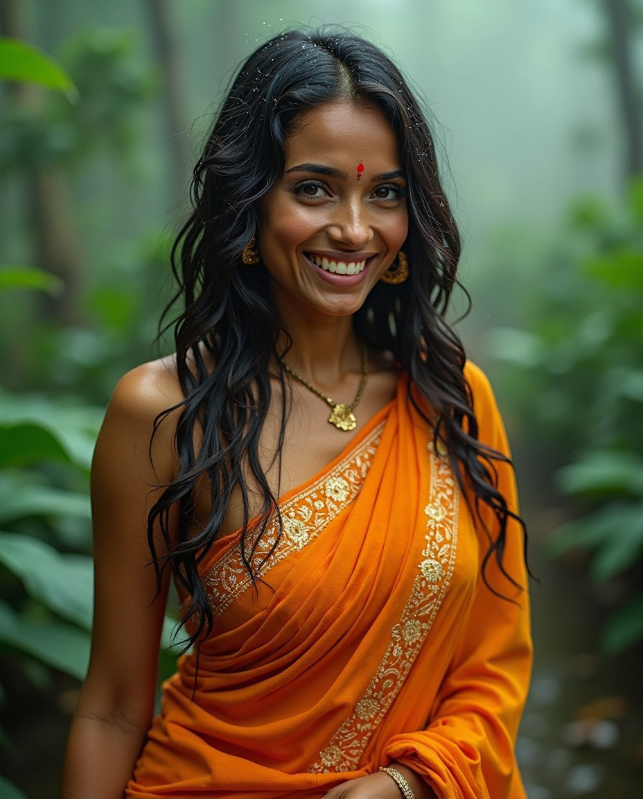 一位令人惊叹的印度女人,一头浓密的黑发垂在她的背上,温暖的金棕色皮肤闪着微妙的光泽,自豪地在她的额头上戴着一个小而华丽的bindi,因为她高高耸立,身材丰满,披着鲜艳的橙色纱丽,闪闪发光的金色刺绣和深,圆领上衣,突出了她的曲线,闪闪发光的雨滴,她的明亮,黑暗的眼睛闪闪发光的喜悦和幸福,她直接凝视着相机,轻松的特征被略微降低的眼睑和轻轻拱起的眉毛所包围,传达出一种无拘无束的满足感和解放感,在梦幻,朦胧的背景下,郁郁葱葱的翠绿色叶子和闪闪发光的雨滴紧贴着她的皮肤和衣服,捕捉印度文化的活力精髓和季风季节的振兴之美。