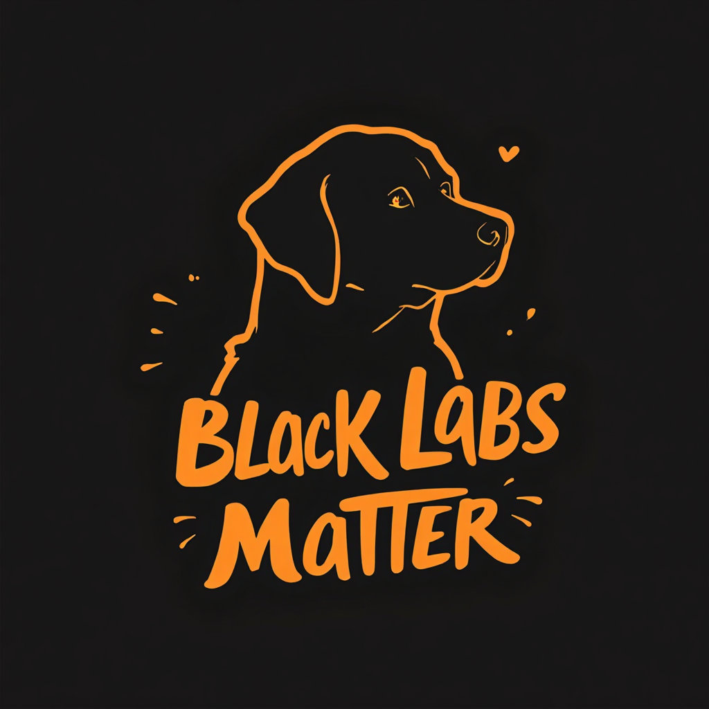 黑色和明亮的橙色徽标,带有艺术,可爱,有趣的程式化字体的文字 “black Labs matters”。字母是大胆的,弯曲的,动态的,传达一种运动,快乐和能量的感觉。文字上方有一个简约,可爱的剪影拉布拉多猎犬头。图像的背景是黑色的,提供了醒目的现代对比,因此我们可以将其用于贴纸。