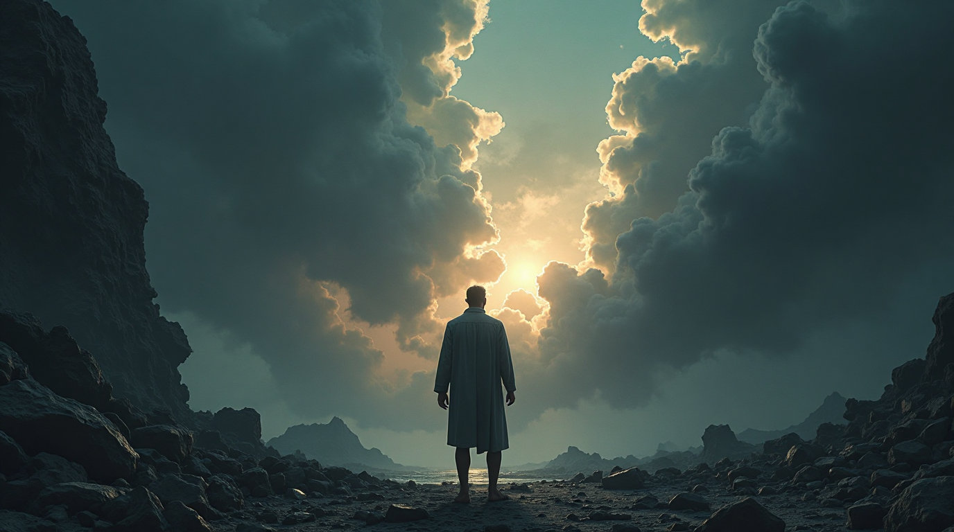 一个电影数字插图,一个男人站在一个荒凉的景观中,摇摇欲坠的混凝土和破碎的愤怒符号,如扭曲的火焰和破碎的拳头。他身着简单的灰色外衣,散发出柔和,温暖的金色光芒,与黑暗的环境形成鲜明对比,传达出深刻的宁静气氛。背景以深蓝色,黑色和灰色的漩涡风暴为主,标题 “El Silencio es Poder” 以大型优雅的衬线字体显示在顶部,副标题 “Domina tus emocines antes que ellas te dominen a ti” 巧妙地放在下面。戏剧性的灯光突出了男人的轮廓,强调了鲜明的视觉对比,并在混乱中强化了内心平静的主题。