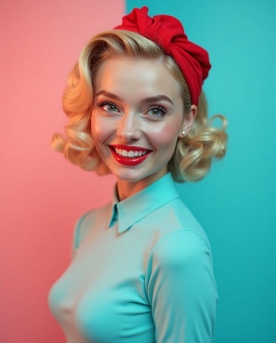在明亮的电影照明中创建一个超现实的方形专辑封面。背景被垂直和对称地分成两个相等的两半: 左侧是柔和的粉红色,右侧是柔软的绿松石。该划分清晰,完美居中,并且在视觉上引人注目。 在前景中,捕捉一位年轻,美丽的金发美国女性的特写肖像,其风格具有强烈的20世纪50年代复古影响。她戴着大胆的红色头巾,时尚地绑在顶部,明亮的金发被柔软的复古波浪塞住。她的嘴唇充满活力的红色和光泽,补充她的快乐和自信的微笑。 她穿着紧身无袖的20世纪50年代风格服装,色彩鲜艳,鲜艳的蓝色,衣服上没有其他颜色。面料有轻微的光泽,强调复古的合身剪裁,同时保持整体外观干净和标志性。 整个构图采用Wes Anderson风格的对称美学设计-色彩鲜艳,平衡,风格化,具有微妙的电影魅力。 在图像的底部,以大型大胆的复古白色字体显示艺术家名称 “VERONA”,并带有强烈的深色阴影以增强对比度和流行感。在它的正下方,以相同的字体样式,在一个居中的行中显示标题 “粉红色和绿松石色”,与图像完美对齐并对称。