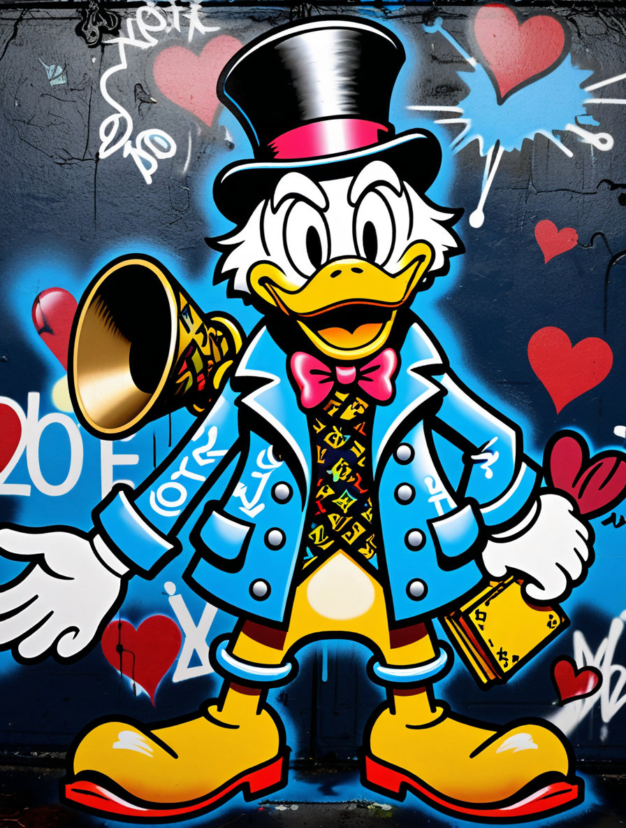 一个非常时尚和丰富多彩的卡通插图的字符Scrooge McDuck在五颜六色的涂鸦,使用路易威登,有很多标签,在涂鸦标记风格,卡通般的,超现实主义的流行艺术风格,城市朋克美学,爱的心,设置在深蓝色背景上,类似于涂鸦墙纸,黑色背景为白色,非常详细,全身肖像,从头到脚,以广角拍摄。-混沌10-ar 3:4-原始-轮廓hmep1nk-风格化850-v 7.0