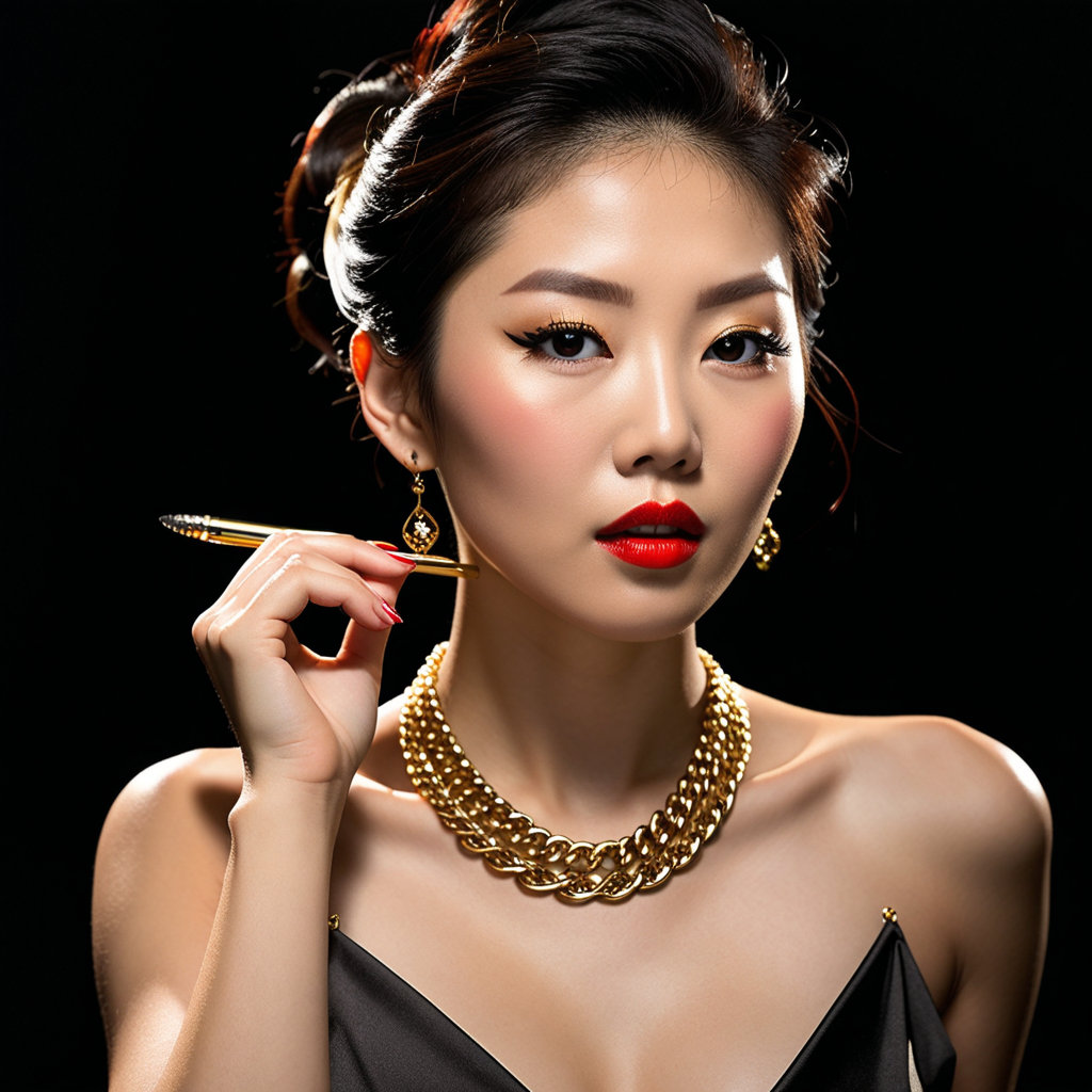 一个戏剧性的工作室肖像照片捕捉了一个迷人的韩国女人,展示了她惊人的美丽和优雅。精确定义的眉毛和大胆的红色唇膏突出了她的黑烟,烟熏的眼睛,用侧面横扫的刘海斯和一条大的金链项链优雅地搁在她的d é colletage上,因为她轻轻地调整了一束散乱的头发四分之三视图姿势。柔和的模糊,深色的渐变背景巧妙地增强了对比度,巧妙地将焦点吸引到 “精致的美”,而精心放置的聚光灯则突出了她完美无瑕的皮肤和雕刻的che骨。Chiaroscurio照明强调光与影的相互作用,营造出迷人而永恒的氛围。下面的话说,淘金者。
