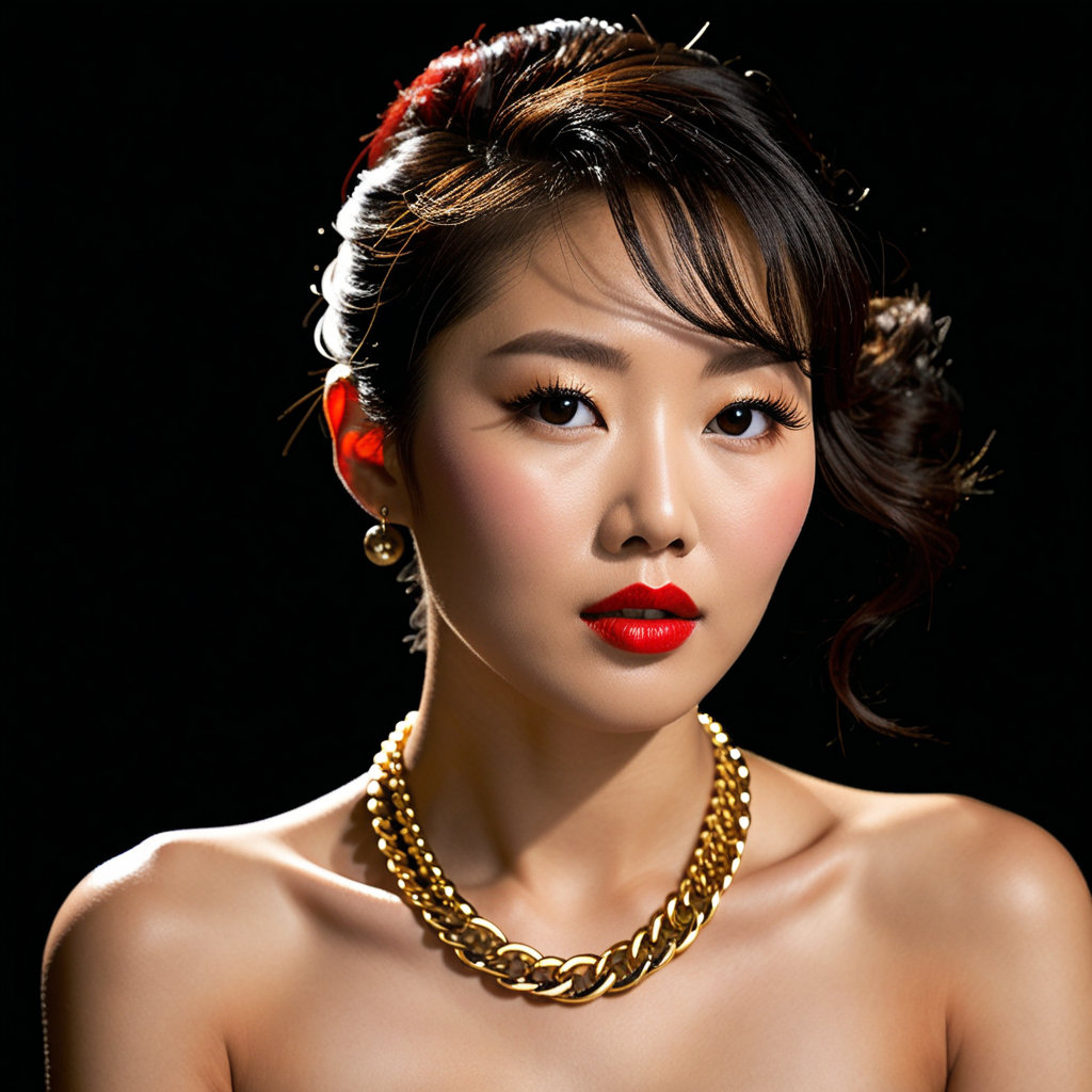 一个戏剧性的工作室肖像照片捕捉了一个迷人的韩国女人,展示了她惊人的美丽和优雅。精确定义的眉毛和大胆的红色唇膏突出了她的黑烟,烟熏的眼睛,用侧面横扫的刘海和一条大的金链项链优雅地搁在她的d é colletage上,因为她轻轻地调整了一束散乱的头发四分之三视图姿势。柔和的模糊,深色的渐变背景巧妙地增强了对比度,巧妙地将焦点吸引到 “精致的美”,而精心放置的聚光灯则突出了她完美无瑕的皮肤和雕刻的che骨。明暗照明强调光与影的相互作用,营造出迷人而永恒的氛围。下面的话说,淘金者。